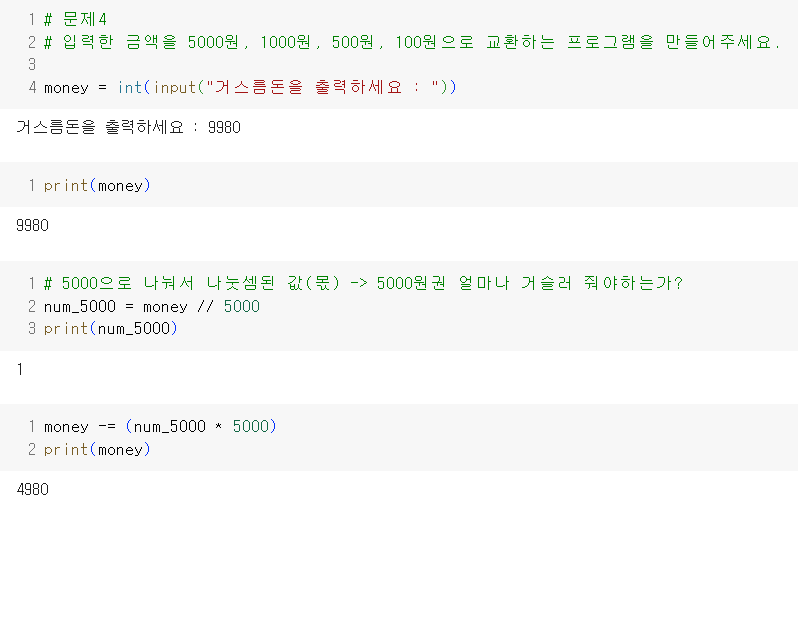 문제 4번의 경우 5000원의 개수를 구한 코드로 1000원, 500원, 100원, 50원, 10원을 거스를 수 있었습니다.
