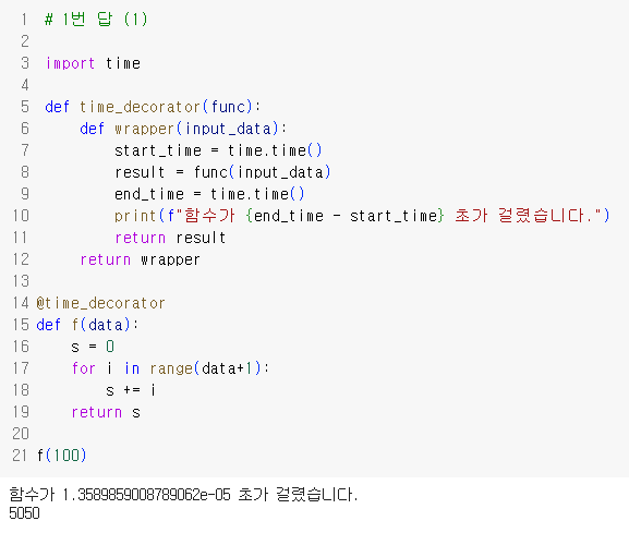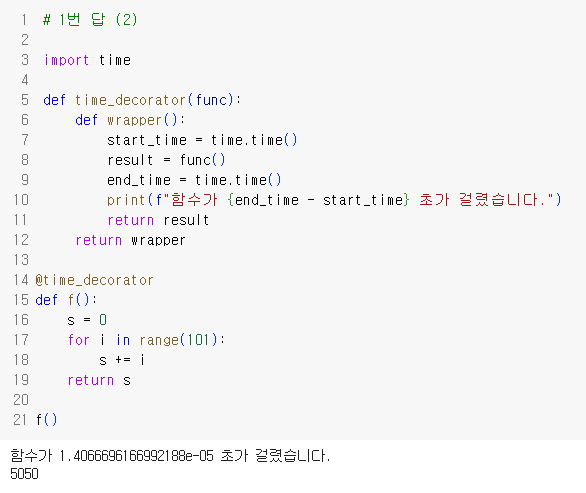 2. 데코레이터 함수 time_decorator가 f 함수를 감싸고 있음, 데코레이터 내부의 wrapper 함수는 f 함수와 같은 시그니처를 가져야 함
