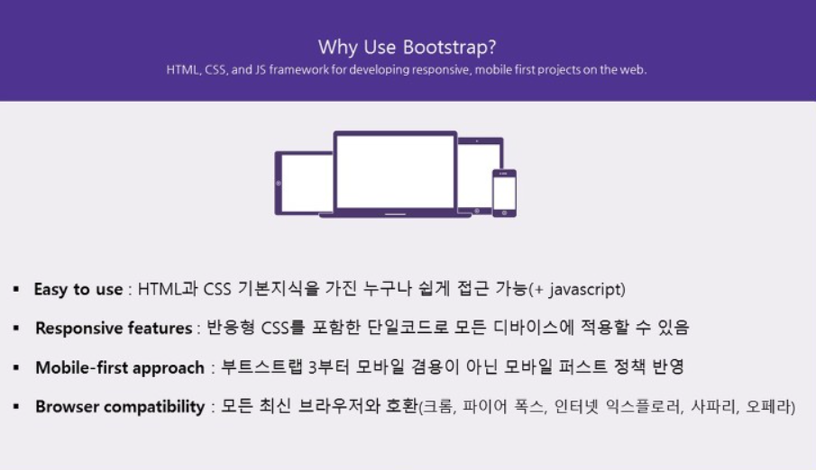 PC뿐만 아니라 태블릿이나 스마트폰 등 모바일 디자인도 지원과 그리드 시스템을 활용하여 반응형 웹 디자인을 지원함