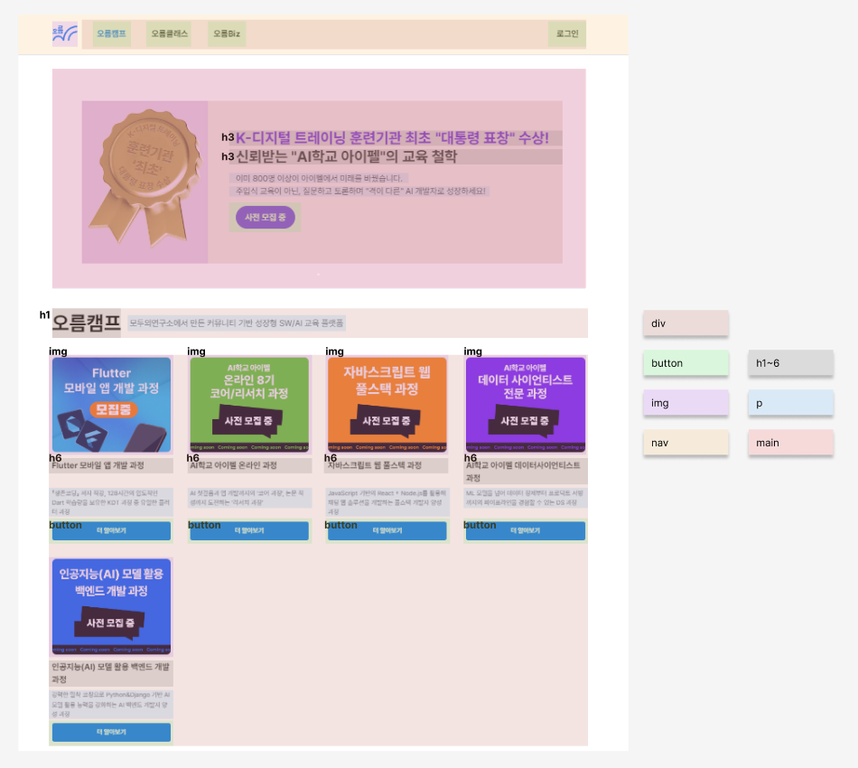 어제 HTML에 이어서 오늘은 CSS에 대해 알아보았습니다. 일단 어제 주셨던 과제는 오름캠프 홈페이지를 HTML 속성을 표시하기였습니다. 왼쪽은 미숙한 제가.. 진행한 것이고 오른쪽은 강사님 파일입니다. 여기까지만 알아보도록 하겠습니다. ㅋㅋㅋㅋ CSS (Cascading Style Sheets, 낙하) 스타일이 적용될 때는 우선순위를 가지고 적용됨 = 우선순위가 적용되는 과정이 마치 폭포처럼 위에서 아래로 떨어지는 모양 (Cascade라는 단어가 생김) 작성한 HTML의 스타일이나 레이아웃 등을 꾸미는 역할 CSS를 한 번 작성해 여러 HTML에 재사용할 수 있음 (반복 작업 감소) 선택자(Selector) 요소에 { 스타일 적용을 시작 속성(Property) - 이 속성에 : 대응 값은 속성값(Pr..
